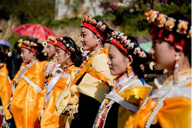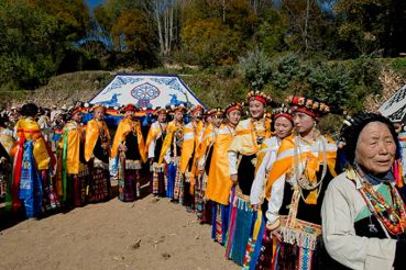盤好發(fā)髻,佩戴好頭飾,在肩、背系好五彩哈達(dá)后,由本村具有威望的女性長者引領(lǐng)來到儀式現(xiàn)場。法號(hào)聲中,煨桑的青煙裊裊升起,威嚴(yán)的活佛主持誦經(jīng)祈福儀式。隨后,德高望重的長者為參加儀式的女子送祝福茶,長輩為姑娘們獻(xiàn)哈達(dá)。一系列儀式結(jié)束后,無論男女老少,都來到場地中央,踏歌起舞,跳起吉祥的鍋莊。