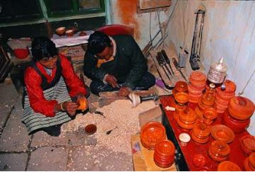 木碗的來源,一是西藏自己生產(chǎn)的,還有一種是云南迪慶生產(chǎn)的,都是從西藏的市場上交換或購買的。西藏林芝地區(qū)的朗縣、察隅,山南地區(qū)的加查、隆子、錯(cuò)那,阿里地區(qū)的噶爾等地均產(chǎn)木碗。其中尤以錯(cuò)那生產(chǎn)的“察牙”木碗和噶爾生產(chǎn)的“堆旭”木碗最負(fù)盛名。以上木碗的原料選擇樹根或樹瘤車制而成,選料之講究,做工之精細(xì),使好木碗的花紋各異,或磷火紋,或豬鬃紋,或貓頭鷹眼紋,這些木碗都很名貴,與普通木碗之間的價(jià)格也很懸殊,一個(gè)上等木碗價(jià)值10頭牦牛,一般人家是不敢問津的,但也盡量想方設(shè)法弄個(gè)像樣的,以慰平生。