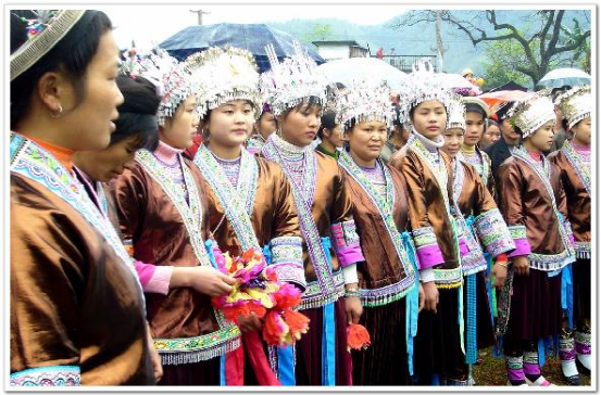 廣西融水縣的香粉古龍坡會(huì)于每年農(nóng)歷正月十六舉行,所以又名“十六”坡。這一天、來(lái)自外國(guó)朋友、各地的游客及當(dāng)?shù)胤綀A十里的苗哥苗妹,提蘆笙,提鳥(niǎo)籠、牽馬匹,打花傘……朝著十六坡趕來(lái)。正午時(shí)分,山梁上、村道間、河溪旁,出現(xiàn)了成列成隊(duì)穿紅戴綠的人群。遠(yuǎn)遠(yuǎn)望去,似一條彩帶在飄動(dòng)。當(dāng)萬(wàn)余人江集后,整個(gè)坡地就成了彩色的世界。