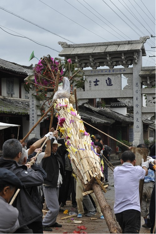 到了這一天,親友鄰居都不請自到來幫忙和祝賀。綁扎柴禾,做小彩旗,栓水果串等,等一切都好,再齊心合力豎起火把。等掛著果串的斗升一點點離開地面,火把樹穩(wěn)穩(wěn)當當挺立的時候,孩子的奶奶和外婆就在火把樹下燃起香,敬上茶酒和米干,虔誠地磕頭祈禱。