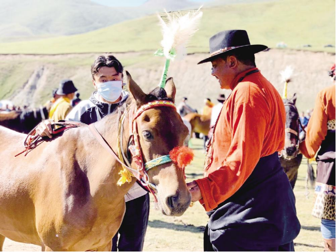 賽馬節(jié)上,主人正在細心照料賽馬。