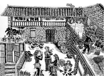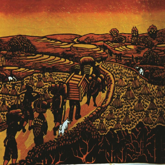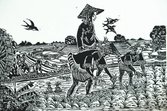云南馬關(guān)壯族農(nóng)民版畫起源于馬關(guān)縣仁和鎮(zhèn)阿峨新寨村,“以刀代筆”是其主要的藝術(shù)形式,刀法粗獷、豪放而不乏細膩,具有濃郁的鄉(xiāng)土氣息和深厚的民族文化內(nèi)涵。