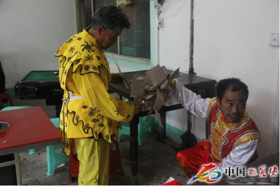 高臺是用5至7張八仙桌一層層疊壘,最上面的桌子四腿朝天,總高度近8米。四人登臺表演。兩個人扮獅子,把獅頭獅皮披在身上,只露雙腳;另外兩人分別裝扮成孫悟空和笑臉和尚揮舞手帕,大蒲扇逗引獅子逐層攀上高臺,為了穩(wěn)固,安全起見,每張桌子的四角都用草紙疊浸水后墊著防滑,做到萬無一失。