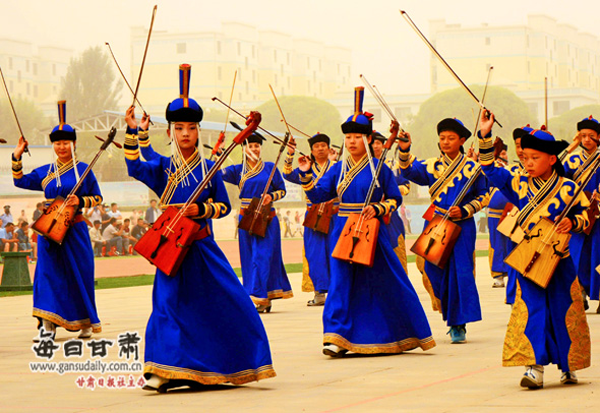 2016年8月底,肅北作為甘肅省唯一以蒙古族民族為主體的自治縣,特意承辦了八?。▍^(qū))第七屆“母語杯”蒙古文書法大賽作品展。在其頒獎(jiǎng)晚會(huì)上,肅北縣烏蘭牧騎登臺(tái)亮相,博得一次次熱烈的掌聲。演出節(jié)目包括:歌曲《父親的故鄉(xiāng)》《陽光下的母親》《不會(huì)忘記》,舞蹈《筷子舞》《薩吾爾登》,馬頭琴齊奏《風(fēng)中的蘇力德》等。