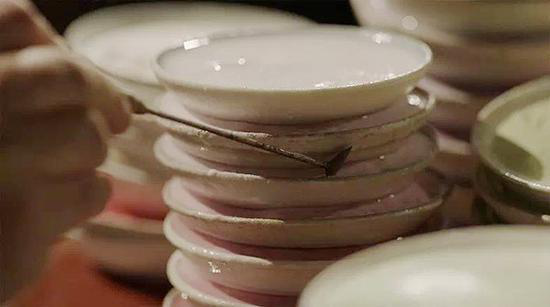 在每一個點藍的師傅面前,都由低到高排著一摞白色小碟,里面是摻了水的釉料。細看去,同樣是紫色,但從深紫到淺紫,竟然能分出十多種層次來。制作精良的景泰藍作品,對點藍要求很高。一片花瓣,要描繪顏色的漸變,就要由深入淺潤染幾個層次,才能表現(xiàn)出花朵特有的美感——這也是景泰藍的魅力所在,如果一朵花瓣只涂一二種顏色,功夫省了,景泰藍之美也消失了。