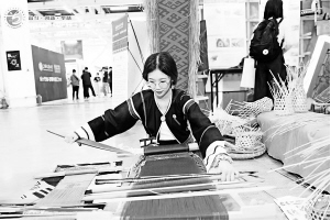 2021年5月,在第六屆全國大學(xué)生藝術(shù)展演活動現(xiàn)場,海南師范大學(xué)學(xué)生展示黎族腰織機(jī)織錦技藝。第六屆全國大學(xué)生藝術(shù)展演活動組委會供圖