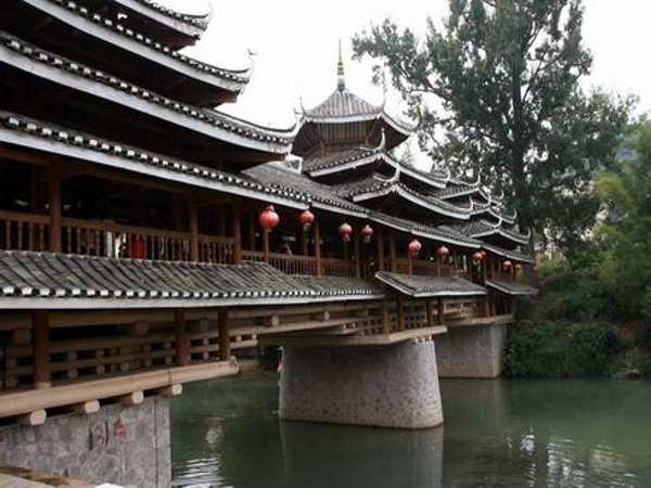 瑤族風雨橋,又被稱之為“涼橋”或“風水橋”。除木橋外,大多是在石拱橋上加蓋橋廊、橋亭和在橋頭的橋臺上建閣樓,穿斗式木構架,二層檐或三層檐,有的四層檐,通高在9米~10米間。風雨橋不僅是路人避雨之處,也是瑤族男女青年談情說愛的約會場所。廣西瑤族風雨橋主要集中在富川瑤族自治縣和恭城瑤族自治縣。富川縣保存至今的古代瑤族風雨橋有18座,其中著名的有迥瀾橋(建于明萬歷年間),青龍橋(與前者同時期修建),以及福壽橋、高橋、鳳溪新橋、皇侯泉橋、東轅橋、鸕鶿塘瀾通橋、龍歸橋、興隆橋等。