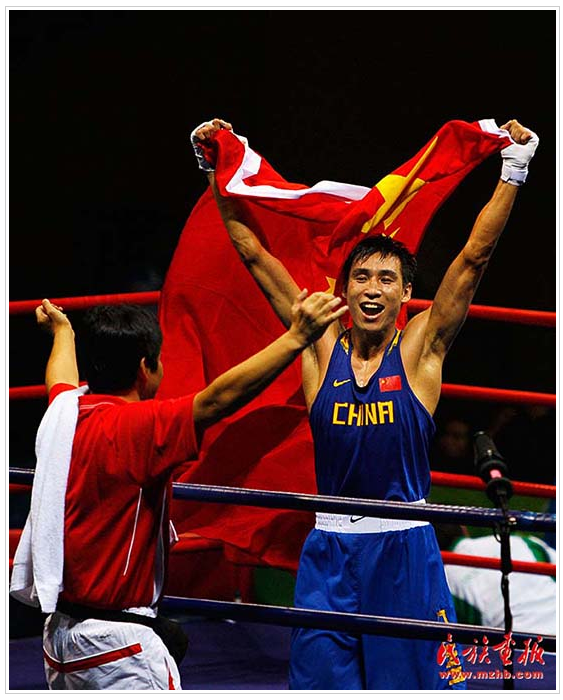 蒙古族拳擊運(yùn)動員張小平獲北京奧運(yùn)拳擊比賽金牌(民族畫報資料)