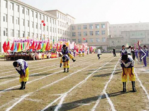 陣擺長龍跑馬城。“分兵遣將選良才,陣擺長龍對面排。正欲齊心奪勝券,格格送信出城來?!边@首詩描寫的是滿族兒童春季玩的一種游戲——“跑馬城”。玩這種游戲時,孩子們分成人數(shù)相同的兩隊橫列,面向而站。玩時,甲隊先誦兒歌一句,乙隊接下句,一遞一句:“機機靈,跑馬場,馬城開,打發(fā)格格送信來!”“你要誰?我要某某某!”被點到名字的兒童立刻向?qū)Ψ經(jīng)_去,對方陣營則手臂相連形成一道防線,沖撞者如果沖破對方的防線,就從對方陣營中挑選一人帶回自己的隊伍;如果沒有沖破對方的防線,沖撞者就被對方俘虜了。然后雙方再進行下一輪“對話”和“沖營”。游戲結(jié)束時,以剩下人數(shù)多的一方為勝方。這種游戲最適合男孩玩,他們往往玩得滿頭大汗,樂此不疲!