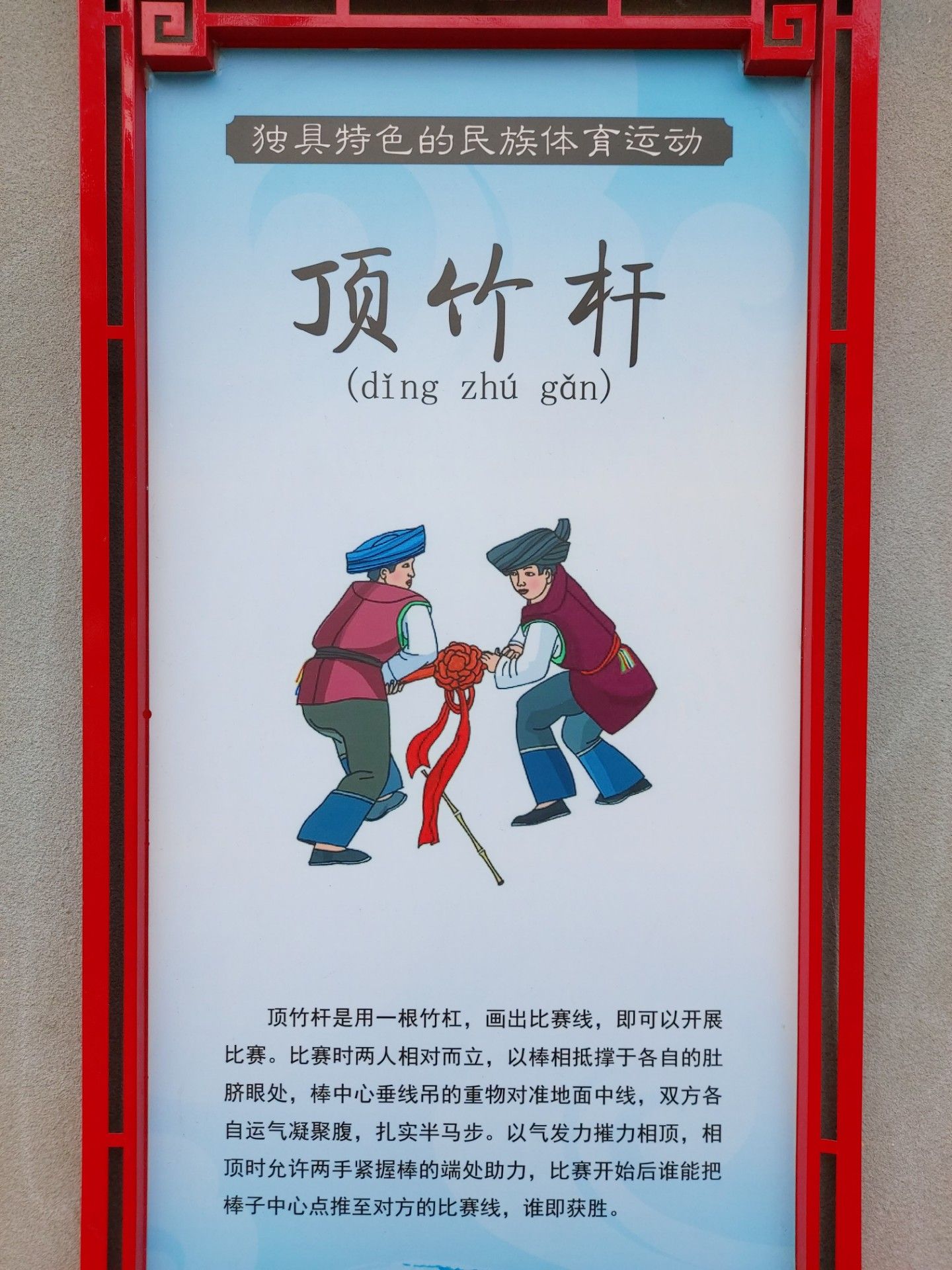 頂竹桿是用一根竹杠,畫出比賽線,即可以開展比賽。比賽時(shí)兩人相對(duì)而立,以棒相抵撐于各自的肚臍眼處,棒中心垂線吊的重物對(duì)準(zhǔn)地面中線,雙方各自運(yùn)氣凝聚腹,扎實(shí)半馬步。以氣發(fā)力摧力相頂,相頂時(shí)允許兩手緊握棒的端處助力,比賽開始后誰能把棒子中心點(diǎn)推至對(duì)方的比賽線,誰即獲勝。