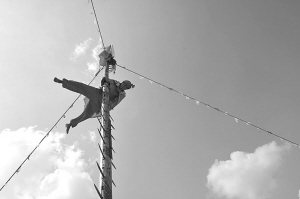 雖然符長洪教了理論絕招,可是在真刀、真火面前,第一次上場的徒弟們還是搖頭再搖頭,扭捏不敢上。此時,恰逢村里有人家邀請符長洪去表演,他就趁機帶著徒弟一起去。表演現場,符長洪用布包著刀刃,要幾個徒弟爬上刀梯。徒弟們上到梯頂后,符長洪卻把布條扯開,露出亮晃晃的刀刃,并在刀梯四周點燃火堆大喊:“下來吧!踩到刀上,走過火堆,你們就出師了!”