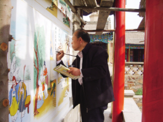 在以后的古建彩繪修繕中,陳進德不斷深入磨煉技術。在彩繪技藝上,他按照建筑群體的不同結構,結合當?shù)貍鹘y(tǒng)習俗,一般建筑外觀以旋子如意彩畫形式配彩,走廊采用蘇氏混彩的藝術布局,突出藝術畫廊的彩畫特色,門扇格子以五彩形式瀝粉配有畫面,突出人物清高、山水大雅、花鳥活潑、博古清香、書法淋漓,既吐納了當?shù)氐墓沤L格,又彰顯了民族文化的積淀。除了注重彩畫技藝,陳進德在顏色工料上也比較講究。