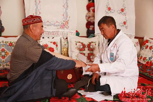 大山里由于情況特殊,有很多孩子是居馬泰·俄白克接生的,名字都是他給起的,經(jīng)常能聽到孩子叫他“醫(yī)生爸爸”。在江蘇援疆醫(yī)生的“傳幫帶”下,居馬泰·俄白克系統(tǒng)地學(xué)習(xí)了中醫(yī)針灸技術(shù)。掌握新診療技術(shù)后,他立即奔赴包扎墩冬牧場開展巡診。他還前往阿勒泰地區(qū)參加哈薩克醫(yī)診療技術(shù)培訓(xùn),提升了自己的診療技術(shù)水平。每年春天,包扎墩庫克蘇溫泉衛(wèi)生院又會迎來大批患者,為不耽擱放牧,牧民常常早晨8時就來找他看病、輸液。居馬泰·俄白克一忙就是一天,到晚上他還要為受診治牧民建立醫(yī)療檔案,每天都要忙到深夜。