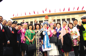 十三屆全國(guó)人大一次會(huì)議開(kāi)幕前,少數(shù)民族代表身著盛裝,在人民大會(huì)堂前留影。 本報(bào)記者 張國(guó)欣攝