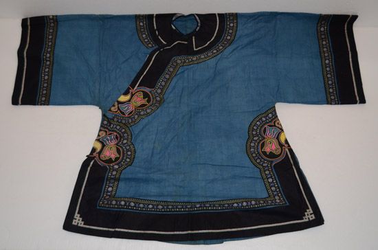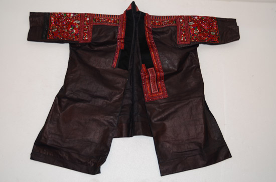 分布在凱里、雷山、丹寨、麻江四縣交界地一帶苗族村寨,以凱里舟溪苗族為代表。該服裝上衣為緞面對(duì)襟衣,刺繡主要在肩袖及袖口部分,以黔東南苗族特有的繭片繡為主,所繡圖案為浮萍花和幾何紋,肩部和背部鑲有銀泡和銀片,具有民族特點(diǎn) 。前、后圍腰片均以繭片繡為主,所繡圖案為浮萍花和幾何紋。
