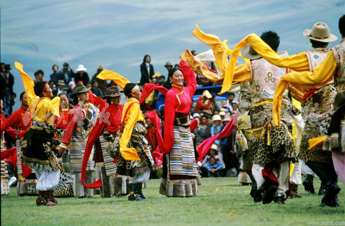 到17世紀(jì)中葉,“雪頓”活動(dòng)內(nèi)容更加豐富,已開(kāi)始演出藏戲,并以哲蚌寺為活動(dòng)中心開(kāi)展活動(dòng),故又稱之為“哲蚌雪頓”,從此便形成了固定的雪頓節(jié)。五世達(dá)賴羅桑嘉措從哲蚌寺移居布達(dá)拉宮后,每年藏歷六月三十日,首先在哲蚌寺舉行藏戲匯演,次日則必須赴布達(dá)拉宮演出。18世紀(jì)下半葉羅布林卡(寶貝圓林)建成,達(dá)賴?yán)镆凭恿_布林卡,雪頓節(jié)的活動(dòng)又從布達(dá)拉宮轉(zhuǎn)移到羅布林卡。每年藏歷七月一日,由拉薩、日喀則、窮吉、雅礱、堆龍德慶、尼木等地的藏劇團(tuán),6個(gè)“扎西雪巴”(藏戲的一種)戲班子,一個(gè)牦牛舞班子和一個(gè)“卓巴”(打鼓舞隊(duì)),在羅布林卡進(jìn)行聯(lián)合演出。屆時(shí),噶廈政府機(jī)關(guān)放假,全體官員要集中到羅布林卡陪同達(dá)賴?yán)镉^看藏戲,中午噶廈政府要專門設(shè)宴招待全體官員,席間不能缺少酸奶,以示對(duì)節(jié)日由來(lái)的紀(jì)念。在此期間,允許拉薩市民及附近藏族群眾進(jìn)入羅布林卡觀看藏戲演出,這便逐漸形成了一整套固定的節(jié)日儀式。雪頓節(jié)經(jīng)過(guò)了300多年的發(fā)展歷史,從宗教節(jié)日演化為藏戲藝術(shù)節(jié)。故此,現(xiàn)代人把雪頓節(jié)稱之為“藏戲節(jié)”。