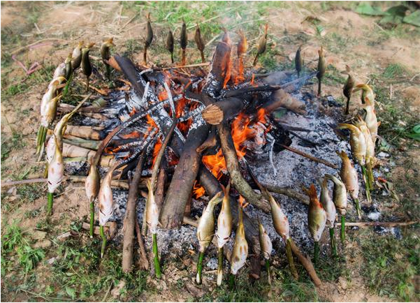 說(shuō)起燒魚(yú),得從古代人類祖先燒肉燒魚(yú)談起。苗族先輩們?cè)陂L(zhǎng)期的遷徙跋涉中,或到西南方向的崇山峻嶺定居后,都要到山下水塘、溪流中捕捉蛙魚(yú)來(lái)充饑,維持生活。由于沒(méi)有鍋頭和碗具,只能燃燒篝火紅炭來(lái)燒烤蛙、魚(yú)至熟,然后上山采摘蕉葉、芒草來(lái)墊盛,大家圍攏在一起一同享用,久而久之便形成了野炊燒魚(yú)的習(xí)慣,一直流傳至今。